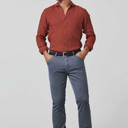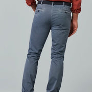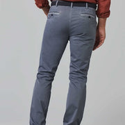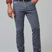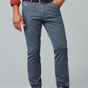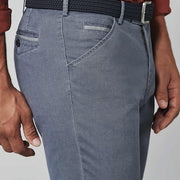 De MEYER-broek in een ontspannen casual style is nu verkrijgbaar in een semi-blauw microdesign dat voor een speciale zomerse look zorgt. Zowel het muntzakje als de geknoopte achterzakken zijn voorzien van een kleurrijk contrasterende bies, die uitstekend past bij de basiskleur. Het zuivere biologische katoen heeft een superstretchkwaliteit die absolute bewegingsvrijheid en maximaal draagcomfort garandeert. Met de hulp van de typische MEYER tailleband.