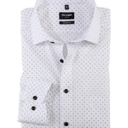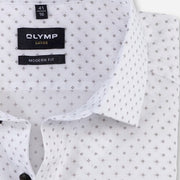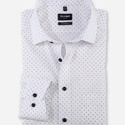 Minimalistische dessins geven zakelijke outfits een individuele tint. De effen katoenen stof van deze OLYMP Luxor modern fit is met behulp van een rotatiedrukproces met een subtiel, harmonieus patroon bedrukt. Hij heeft een sportieve snit en is afgewerkt met een modieuze global kentkraag. Gemakkelijk te onderhouden en strijkvrij.