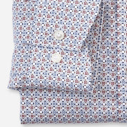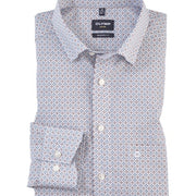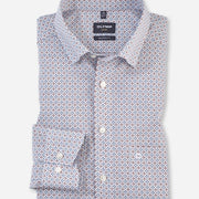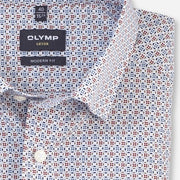 Het slimme minimalistische dessin met veelkleurige grafische rotatieprint op wit zorgt voor een individuele zakelijke look. Gemaakt van 100% katoen met huidvriendelijk draagcomfort en een sportieve OLYMP Luxor-modern-fit-pasvorm. Afgewerkt met een wereldse global kent-kraag. Strijkvrij.