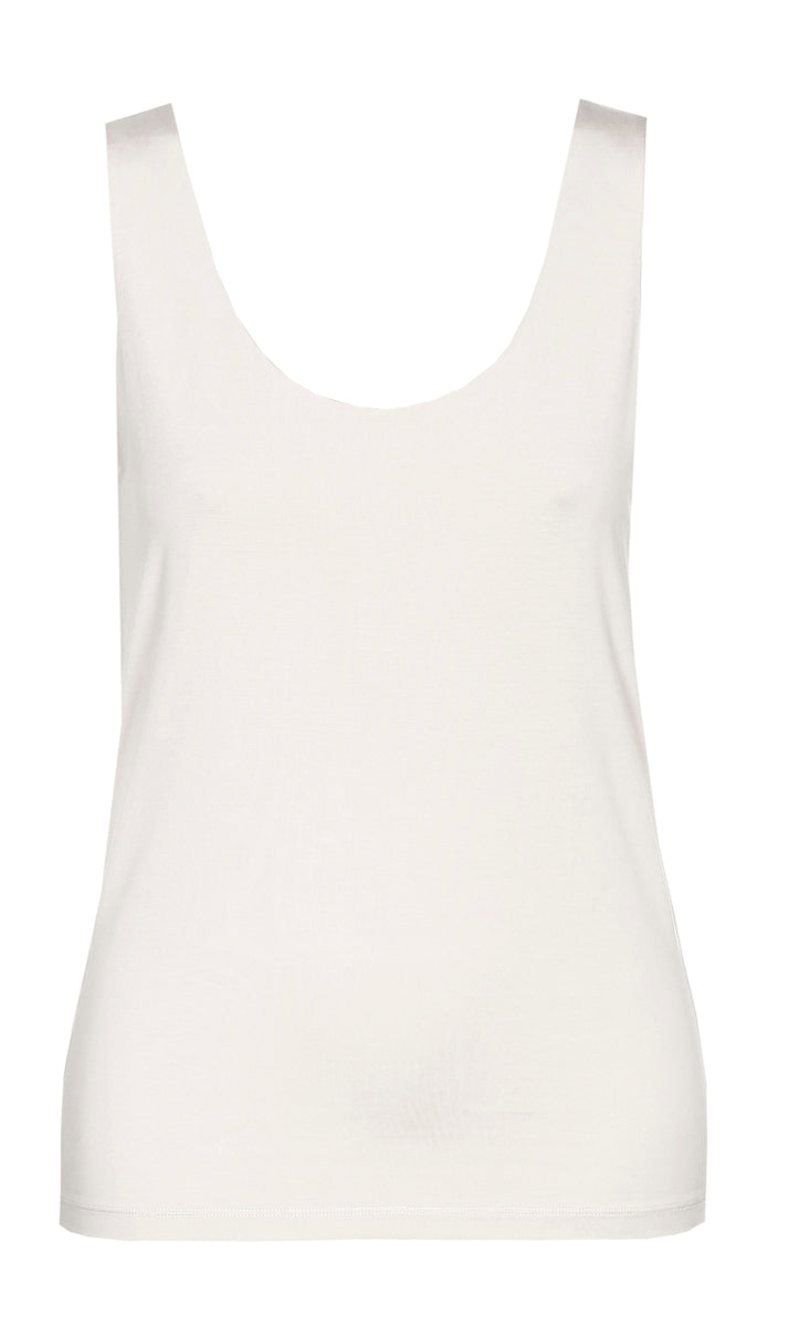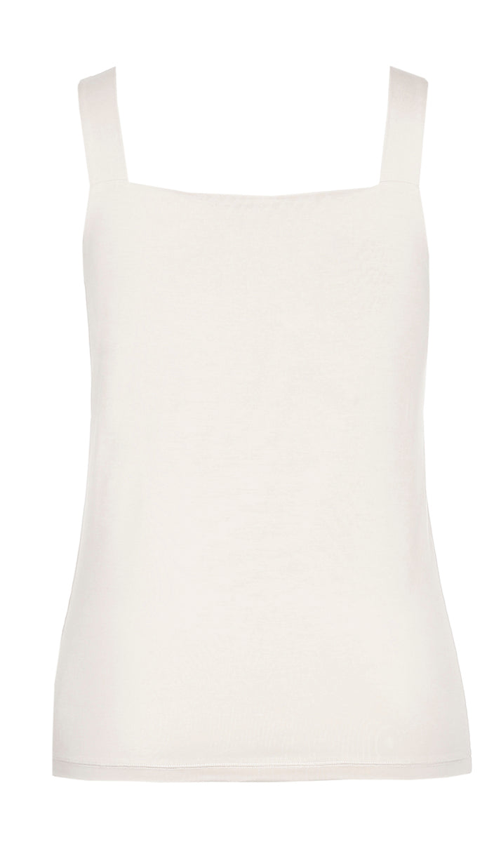 Topje met rechte brede schouderbandjes. Gevoerd aan de boezem. In Tencel of lyocell met een tikje stretch: duurzaam en kwaliteitsvol. Je draagt deze top makkelijk als onderhemdje onder een blouse of jurk.